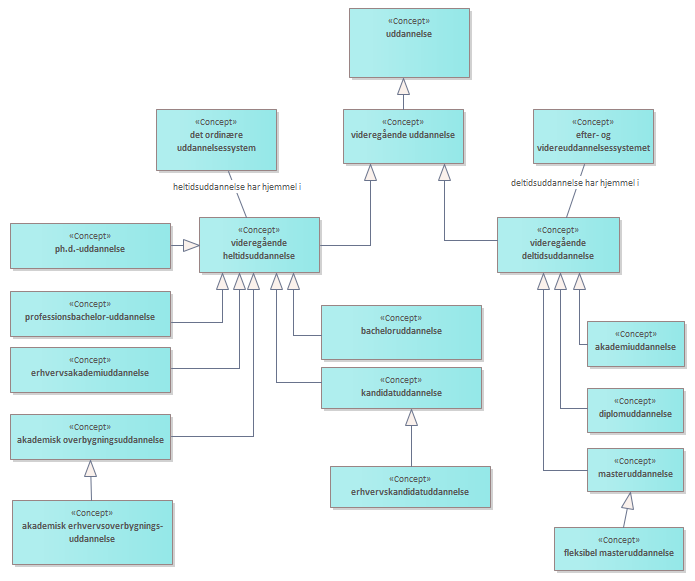Oversigt over de typer af videregående uddannelser der findes i det danske uddannelsessystem, dels som videregående heltidsuddannelse, dels som videregående deltidsuddannelse. De videregående heltidsuddannelser indgår i det ordinære uddannelsessystem, mens de videregående deltidsuddannelser indgår i efter- og videreuddannelsessystemet. <br/><br/>Nye typer af uddannelser kan opstå, og eksisterende typer kan udgå som følge af ændrede bekendtgørelser/lovgivning. <br/><br/>Pilene på diagrammet angiver ”specialisering”, og de læses som ”videregående heltidsuddannelse er en type af videregående uddannelse”, ”bacheloruddannelse er en type af videregående heltidsuddannelse” osv. <br/><br/>Ud over de nævnte typer i diagrammet findes der også andre former af uddannelserne, som går på tværs af de forskellige uddannelsestyper, f.eks. kombinationsuddannelser som både kan være en kandidatuddannelse og en bacheloruddannelse. Et andet eksempel er en fællesuddannelse, hvor den studerende har mulighed for at opnå en dobbeltgrad. <br/>