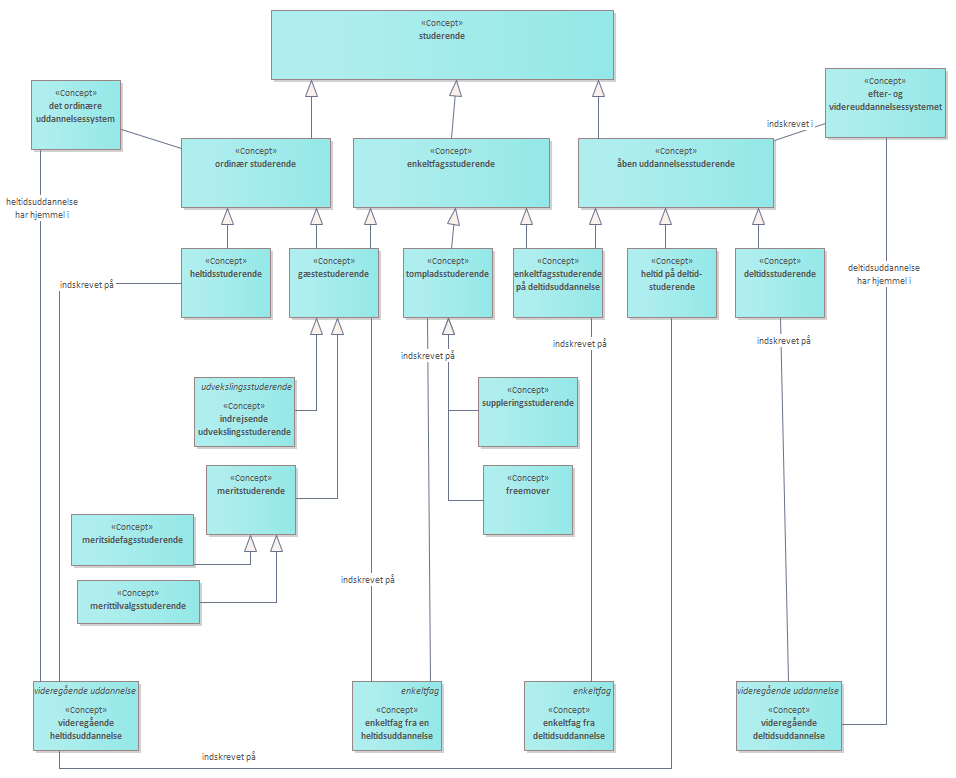 Diagrammet viser de forskellige typer af studerende som kan være indskrevet i enten det ordinære uddannelsessystem eller efter- og videreuddannelsessystemet, også kaldet åben uddannelse. <br/><br/>Begrebet videregående heltidsuddannelse er vist to steder. Det er valgt for ikke at gøre diagrammet uoverskueligt med associationer der krydser flere andre associationer fra den ene side af diagrammet til den anden. Det er her vigtigt at forstå at begrebet fortsat er helt det samme, og at det har begge de viste associationer (”indskrevet på” til både ”heltidsstuderende” og til ”heltid på deltid-studerende”). <br/><br/>Formålet med betegnelserne for de studerende er, at de kan anvendes i den daglige administration, idet de kort og præcist oplyser om typen af uddannelse eller enkeltfag som de studerende er indskrevet ved. <br/><br/>Set i forhold til uddannelsessystemerne er der grundlæggende tre typer af studerende, nemlig ordinær studerende, åben uddannelsesstuderende og enkeltfagsstuderende. De ordinære studerende er indskrevet i det ordinære uddannelsessystem, mens åben uddannelsesstuderende er indskrevet i efter-og videreuddannelsessystemet. Enkeltfagsstuderende kan være indskrevet både i det ordinære uddannelsessystem og i efter- og videreuddannelsessystemet. <br/><br/>Det er f.eks. ikke angivet for en ordinær studerende hvilken uddannelse vedkommende er indskrevet på, idet man her er nødt til at skelne mellem heltidsstuderende og gæstestuderende, hvor førstnævnte er indskrevet på en videregående heltidsuddannelse, og sidstnævnte er indskrevet på enkeltfag fra heltidsuddannelse. <br/><br/>Resten af diagrammet kan læses på tilsvarende vis, og som et andet eksempel kan nævnes at en ”heltid på deltid studerende” er indskrevet i efter- og videreuddannelsessystemet, hvor vedkommende skal betale for uddannelsen, og kan gennemføre den på deltid, men samtidig indskrevet på en videregående heltidsuddannelse, som hører hjemme i det ordinære uddannelsessystem. <br/><br/>Der findes yderligere definerede typer af studerende f.eks. udrejsende udvekslingsstuderende, som ikke er vist i herværende diagram, da disse typebetegnelser ikke er relevante for hvilken uddannelse den studerende er indskrevet ved. For eksempel er udrejsende udvekslingsstuderende også samtidig heltidsstuderende og via denne type ses uddannelsen som den studerende er indskrevet ved. <br/>