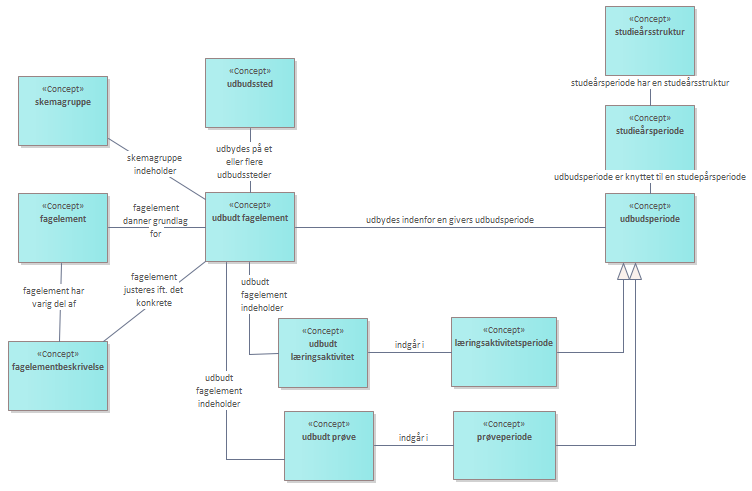 Et udbudt fagelement har sin grundlæggende beskrivelse fra et fagelement i uddannelsesstrukturen, og tilføjer bl.a. udbudsperiode og udbudssted. Ét fagelement kan således danne grundlag for flere forskellige udbudte fagelementer, og i denne sammenhæng kan man se et fagelement som et varigt objekt, mens et udbudt fagelement er et midlertidigt objekt. <br/><br/>Diagrammet viser udbud af fagelementer set fra en administrativ synsvinkel, hvor et udbudt fagelement vil være udbudt med dertil hørende udbudte læringsaktiviteter og udbudt prøve. Et udbudt fagelement er udbudt i en udbudsperiode, som er knyttet til en given studieårsperiode, og som tidsmæssigt indeholder både prøveperiode og læringsaktivitetsperiode. <br/><br/>En udbudsperiode har undertyperne læringsaktivitetsperiode og prøveperiode. En udbudsperiode er samtidigt knyttet til en konkret studieårsperiode, hvilket dog ikke betyder at udbudsperioden nødvendigvis ligger kalendermæssigt inden for studieårsperioden. <br/><br/>Studieårsperioden, der f.eks. kan være fra 1. september til 31. august det følgende år, er opdelt i en studieårsstruktur, der eksempelvis kan fastlægge semestre og sommerskole. <br/><br/>Et udbudt fagelement kan af det enkelte universitet udbydes på et eller flere udbudssteder, f.eks. hvis universitetet har mere end én campus. <br/>Skemagruppe er en samling af udbudte fagelementer, som både de studerende og administrationen bruger til planlægning. De udbudte fagelementer tildeles forskellige skemagrupper, som gør at de enkelte fagelementers læringsaktiviteter ikke overlapper hinanden. <br/><br/>Den fagelementbeskrivelse, der er knyttet til det udbudte fagelement, indeholder de aktuelle og specifikke oplysninger i forhold til udbuddet, mens den varige og grundlæggende del af beskrivelsen der er gældende for flere udbud af fagelementet skal findes i tilknytning til fagelementet i uddannelsesstrukturen. Se nærmere forklaring ved diagram 1.3. <br/>