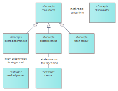 En bedømmelse har en censurform, som fortæller hvilken type aktører der udfører bedømmelsen ved en prøve. <br/><br/>Ved en bedømmelse er eksaminator altid til stede. Hvis der ikke deltager andre bedømmere er der tale om en type af bedømmelse der kaldes ”uden censur”. Hvis der deltager en medbedømmer er det ”intern bedømmelse”, og hvis der deltager en censor er det ”ekstern censur”. Deltagelse af medbedømmer og censor samtidigt er ikke en mulighed. <br/><br/>Censurform angiver for en konkret bedømmelse hvilken af de tre typer der var tale om. <br/><br/>Bedømmelser planlægges for udbudte prøver og prøveresultat registreres for den enkelte studerende i tilknytning til personlig prøve. Se diagram 3.4. <br/>