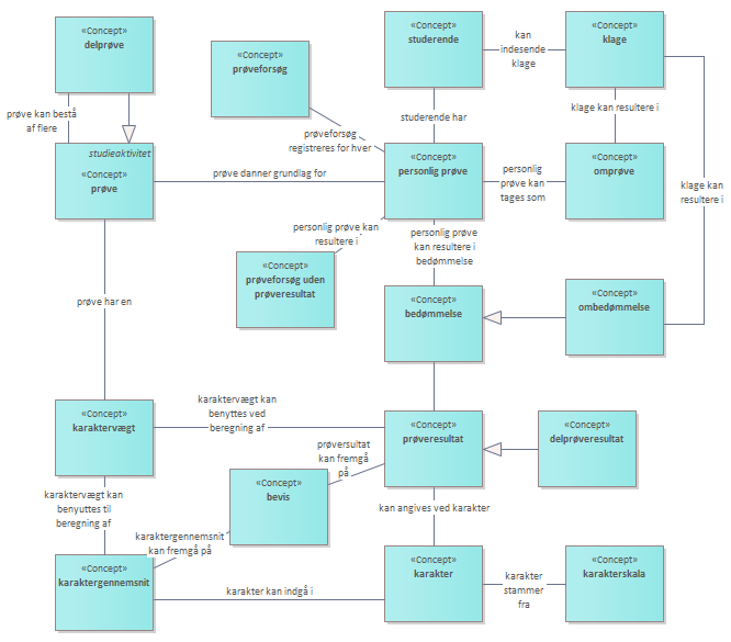 En bedømmelse foregår som beskrevet ovenfor (diagram 3.5) for den udbudte prøve. Prøveresultatet gives i forbindelse med den personlige prøve og følger den bedømmelsesform jf. (diagram 1.4), som er angivet på den udbudte prøve. <br/><br/>Bedømmelsen er en vurdering af i hvilken grad den studerende har opnået fagelementets læringsmål. Dette gøres med en personlig prøve, som den studerende har fået i kraft af en tilmelding til en udbudt prøve, hvor den udbudte prøve og den personlige prøve begge har grundlag i en prøve i studieordningen. Den personlige prøve kan evt. have grundlag i en delprøve. <br/><br/>Bedømmelsen resulterer i et prøveresultat (evt. et delprøveresultat), som angives i henhold til kravet fra bedømmelsesformen, dvs. enten som en karakter fra en karakterskala eller en af værdierne ”bestået” eller ”ikke bestået”. <br/><br/>Når en prøve består af delprøver skal der ske en bedømmelse af, og gives en karakter for hver enkelt delprøve (delprøveresultat). Delprøveresultaterne skal danne baggrund for beregningen af prøveresultatet for selve prøven. <br/><br/>En personlig prøve kan også resultere i et prøveforsøg uden prøveresultat, som er en form for resultat, der ikke er opnået på grundlag af en bedømmelse, men derimod er en administrativ afgørelse, f.eks. ’udeblevet’, ’afleveret for sent’ o.l. Et prøveforsøg uden prøveresultat tæller som et prøveforsøg på lige fod med en prøve der har resulteret i en bedømmelse. <br/><br/>Den studerende kan klage over bedømmelsen og få en ombedømmelse, som så vil resultere i et nyt prøveresultat. Alternativt kan den studerende få tilbudt en omprøve. <br/><br/>Et prøveresultat kan fremgå på et bevis og kan ud over karakter, også være f.eks. bestået/ikke bestået eller godkendt/ikke godkendt. <br/>