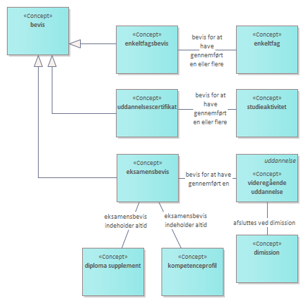 Et bevis er i relation til videregående uddannelse defineret til at være en dokumentation for et gennemført studieforløb. Et studeforløb er gennemført når samtlige fagelementer og grupperinger er bestået efter gældende uddannelsesregler på uddannelsen.<br/><br/>Uddannelsescertifikater dækker over alle beviser, som ikke er et eksamensbevis eller et enkeltfagsbevis. Vægdiplom, minorbevis og honours diplom er alle eksempler på uddannelsescertifikater. <br/>